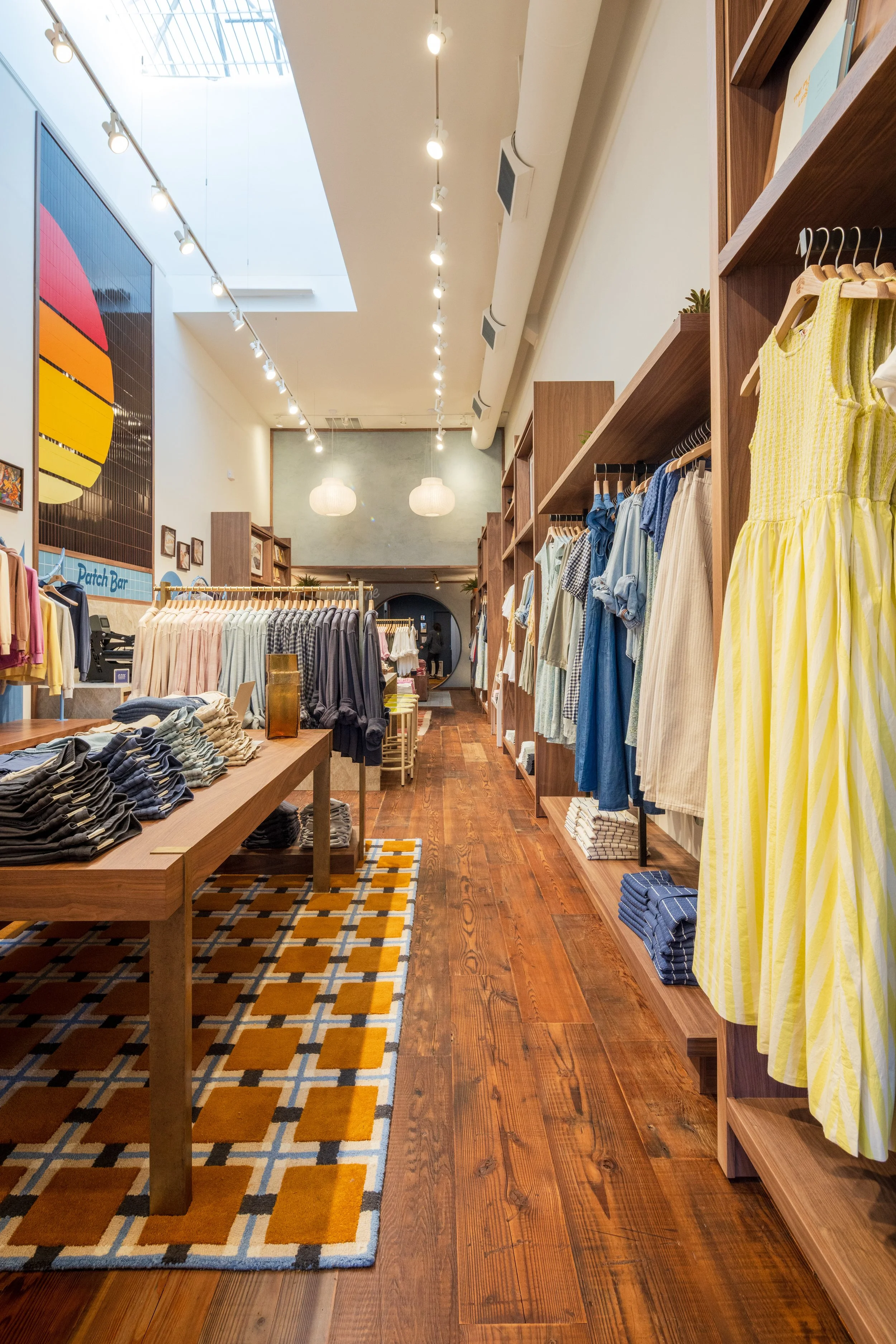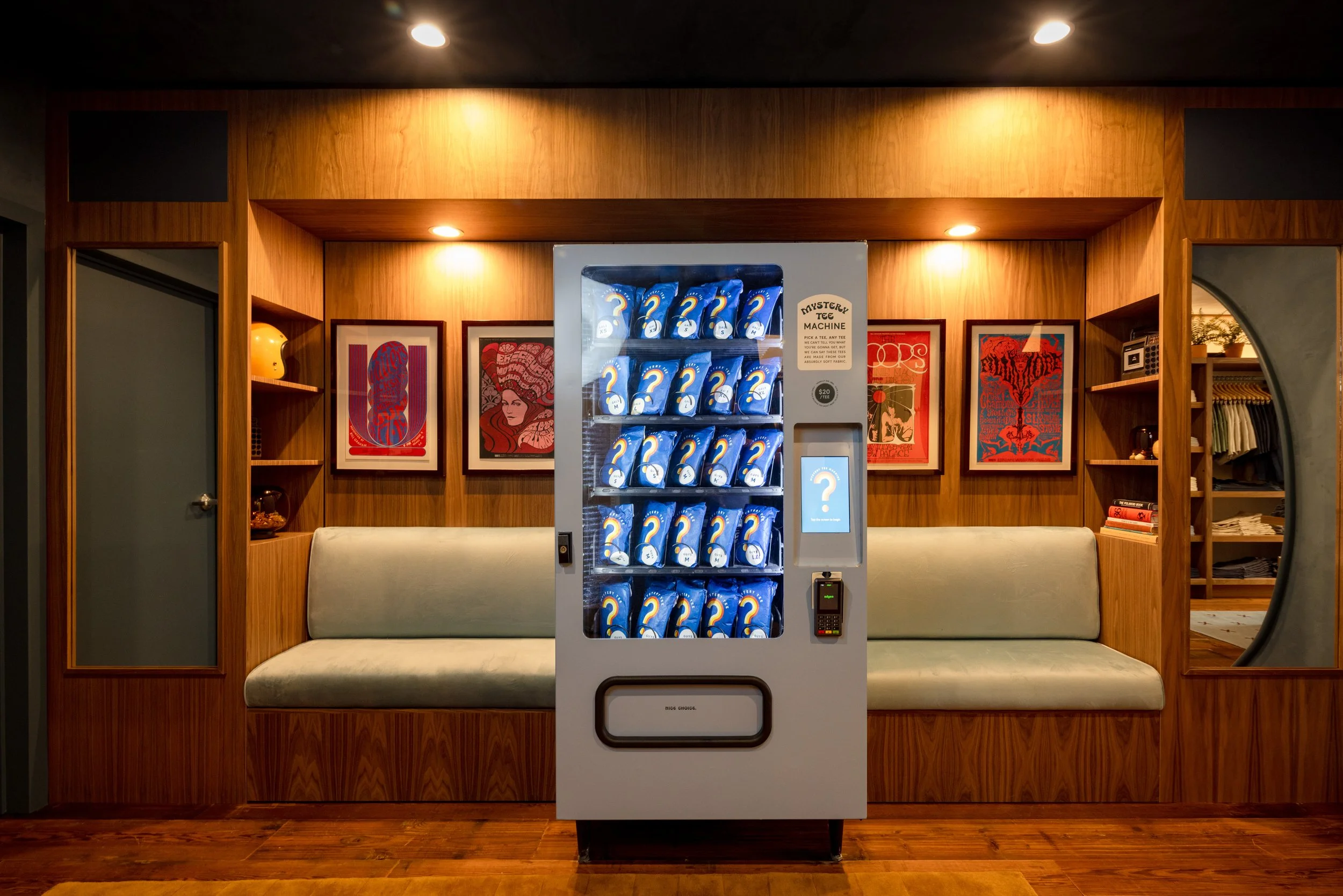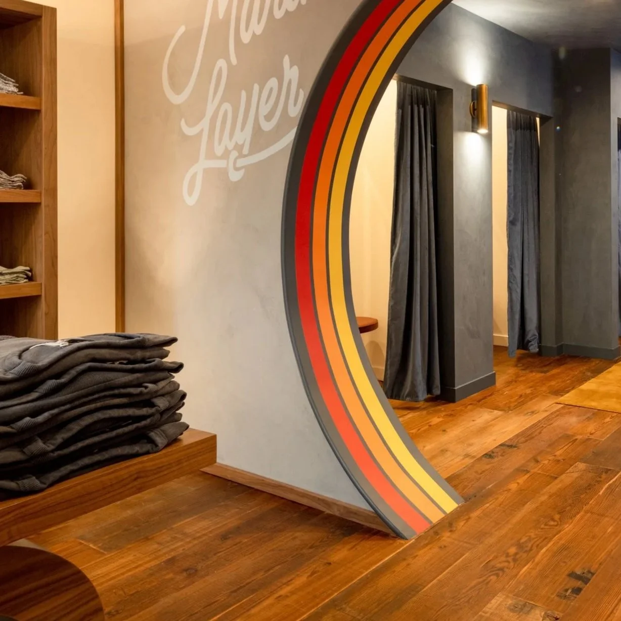 Above the center console wall, a set of custom records spin “Oh Hey”. I designed three unique sets; the store team can swap them out for fun.