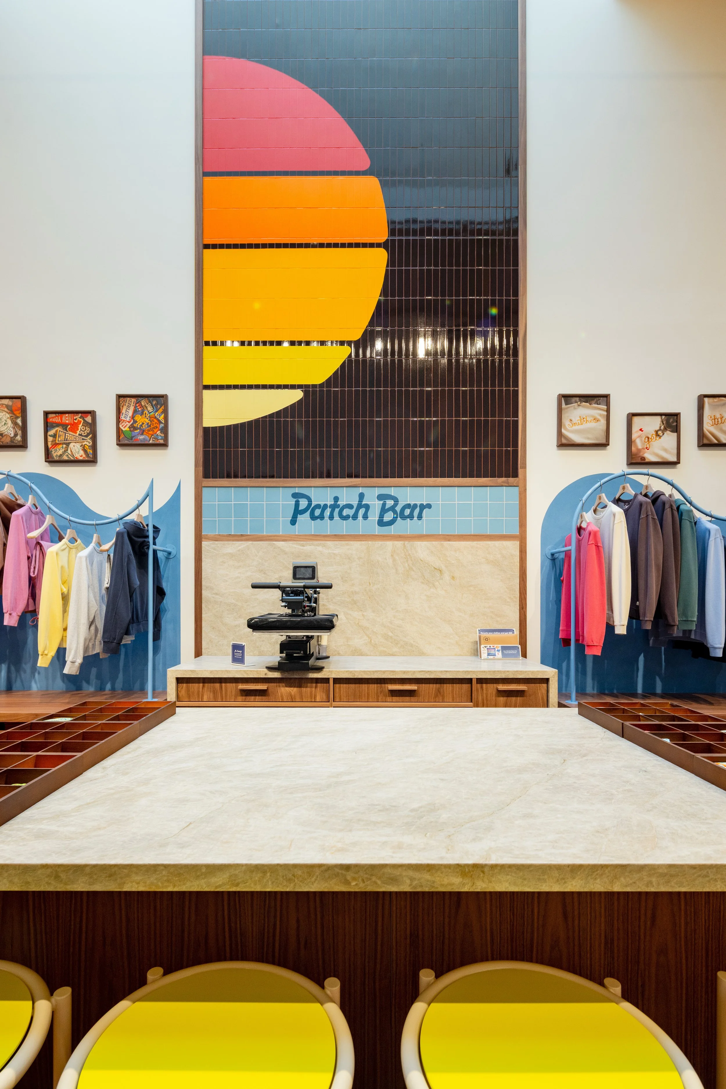We pushed the Brand (and street level) impact with a massive, custom-fabricated sun, radiating with punchy white-grouted tile.